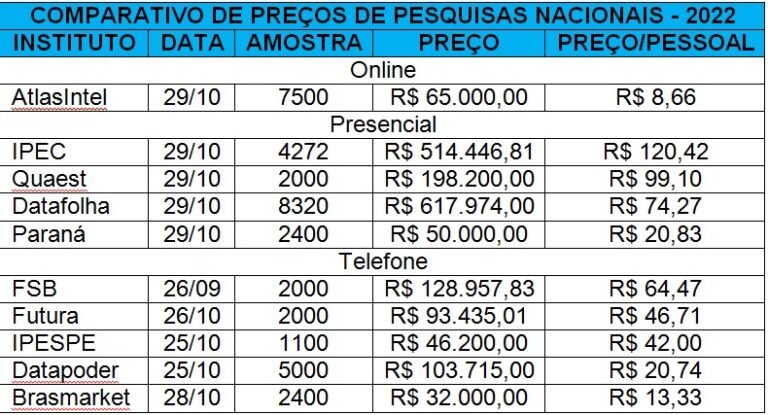 Para não dizer que não falei em flores, ainda há um exemplo que merece menção, advindo da iniciativa privada: é o caso do instituto AtlasIntel, uma startup brasileira, sediada em São Paulo, pertence a um romeno radicado há mais de uma década no país. Tal instituto representa uma quebra de paradigmas no universo das pesquisas de opinião pública, pois que criou seu método autoral de coleta de dados, denominado Random Digital Recruitment (RDR), feito 100% via coleta web, e que desde 2019 apresenta os melhores resultados nas coberturas eleitorais, em termos de acertos, em vários países como Argentina, Colômbia, Chile, Espanha e Estados Unidos, e aqui mesmo no Brasil, onde as pesquisas foram as mais precisas em 9 dos 11 estados em que realizou levantamentos sobre as disputas locais, inclusive apontando tendências não capturadas por outros institutos, a exemplo da ‘virada’ de Elmano de Freitas (PT) sobre Capitão Wagner (UB), no Ceará, e de Jerônimo (PT) sobre ACM Neto (UB), na Bahia, da previsão de vitória de Marcos Pontes (PL) na disputa ao Senado, em São Paulo, e da projeção de vitória do Sérgio Moro (UB) para o Senado, no Paraná. Detalhe: precisão em resultados aliada à eficiência, hava vista o custo muito abaixo das pesquisas em relação ao cobrado por institutos tradicionais. AtlasIntel cobra até R$ 65 mil por um levantamento, enquanto IPEC (antigo IBOPE) chega a faturar mais de R$ 500 mil por um trabalho de mesma abrangência, e o Datafolha até R$ 600 mil, conforme tabela a seguir: