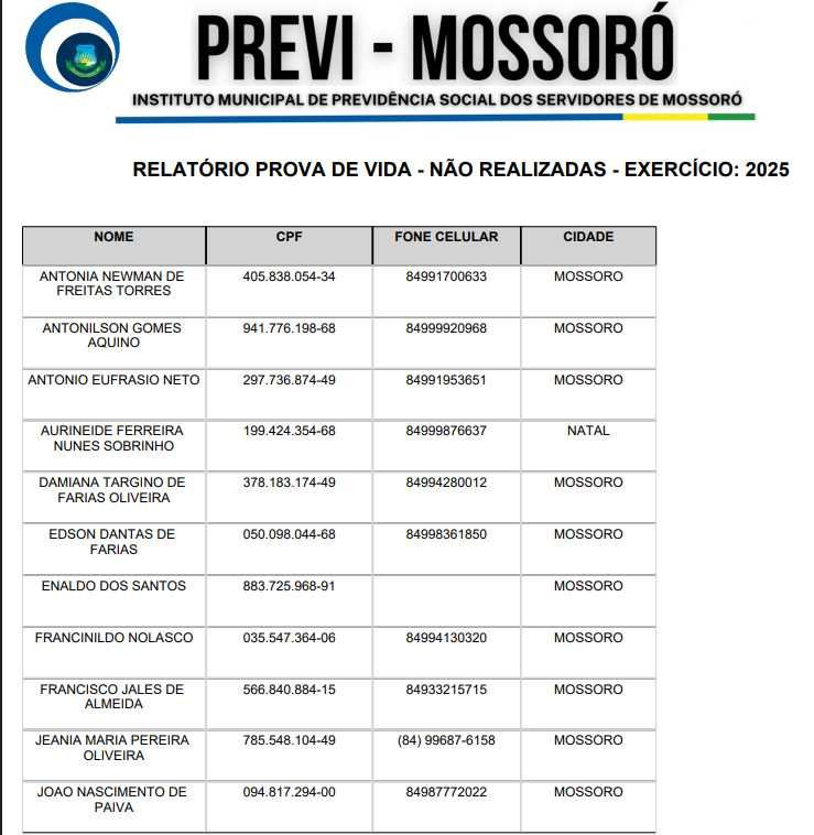 O Instituto Municipal de Previdência Social dos Servidores de Mossoró (Previ Mossoró) emitiu nova lista de convocação para beneficiários que não realizaram a devida atualização da prova de vida, que pode ser apresentada de forma inteiramente digital.